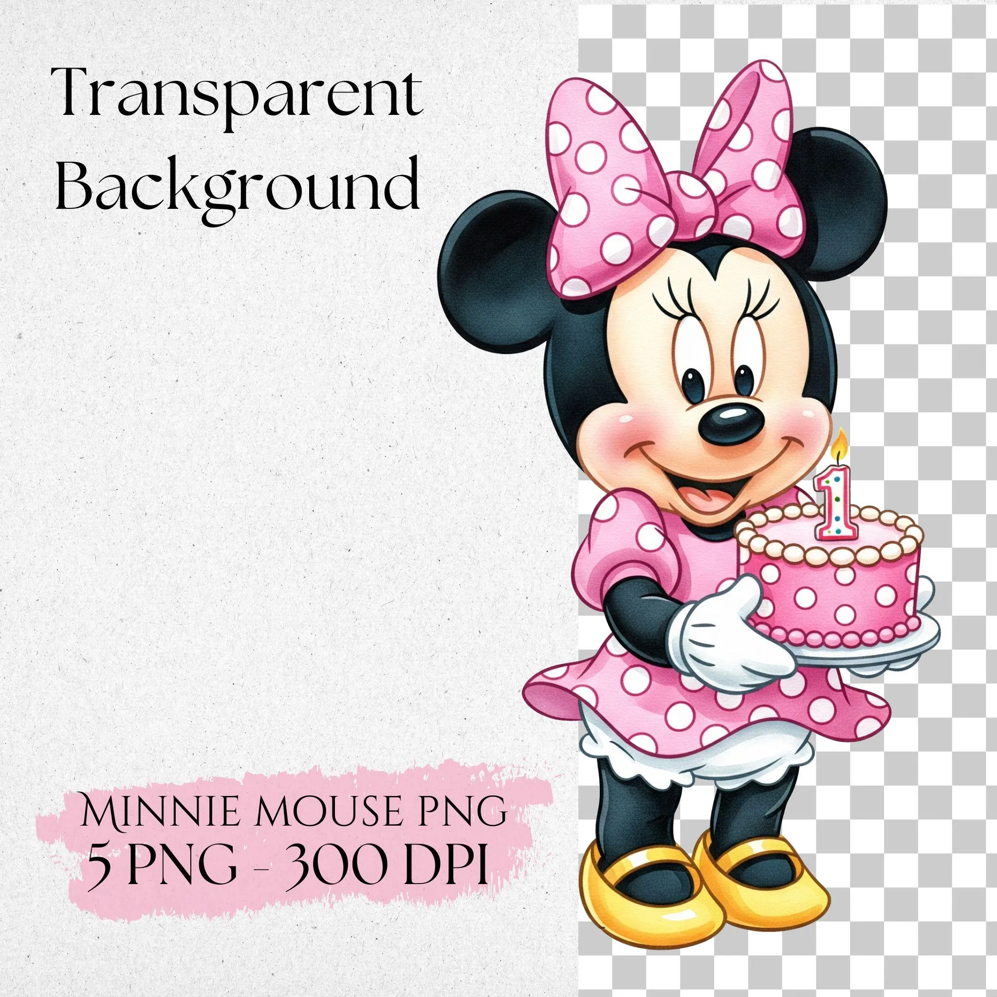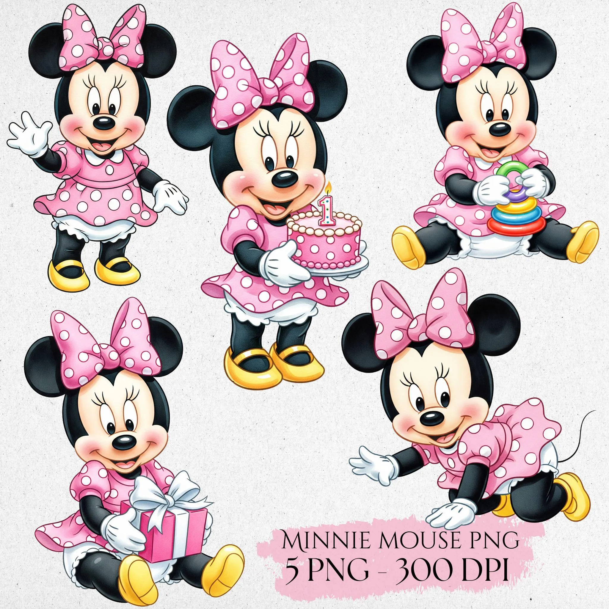 Baby Minnie Mouse Watercolor Clipart - Pink Bow Character PNG Bundle for Girl Birthday Decor