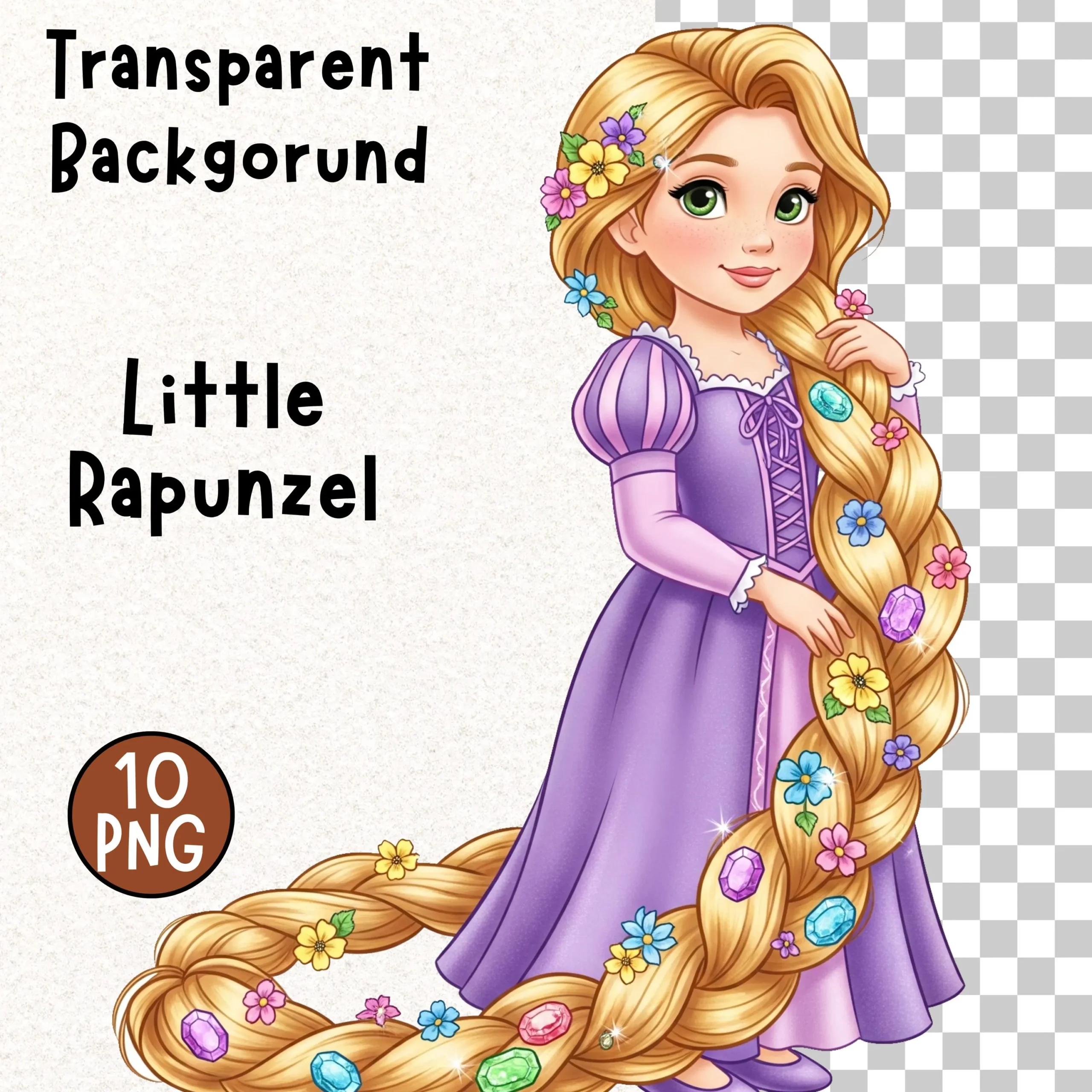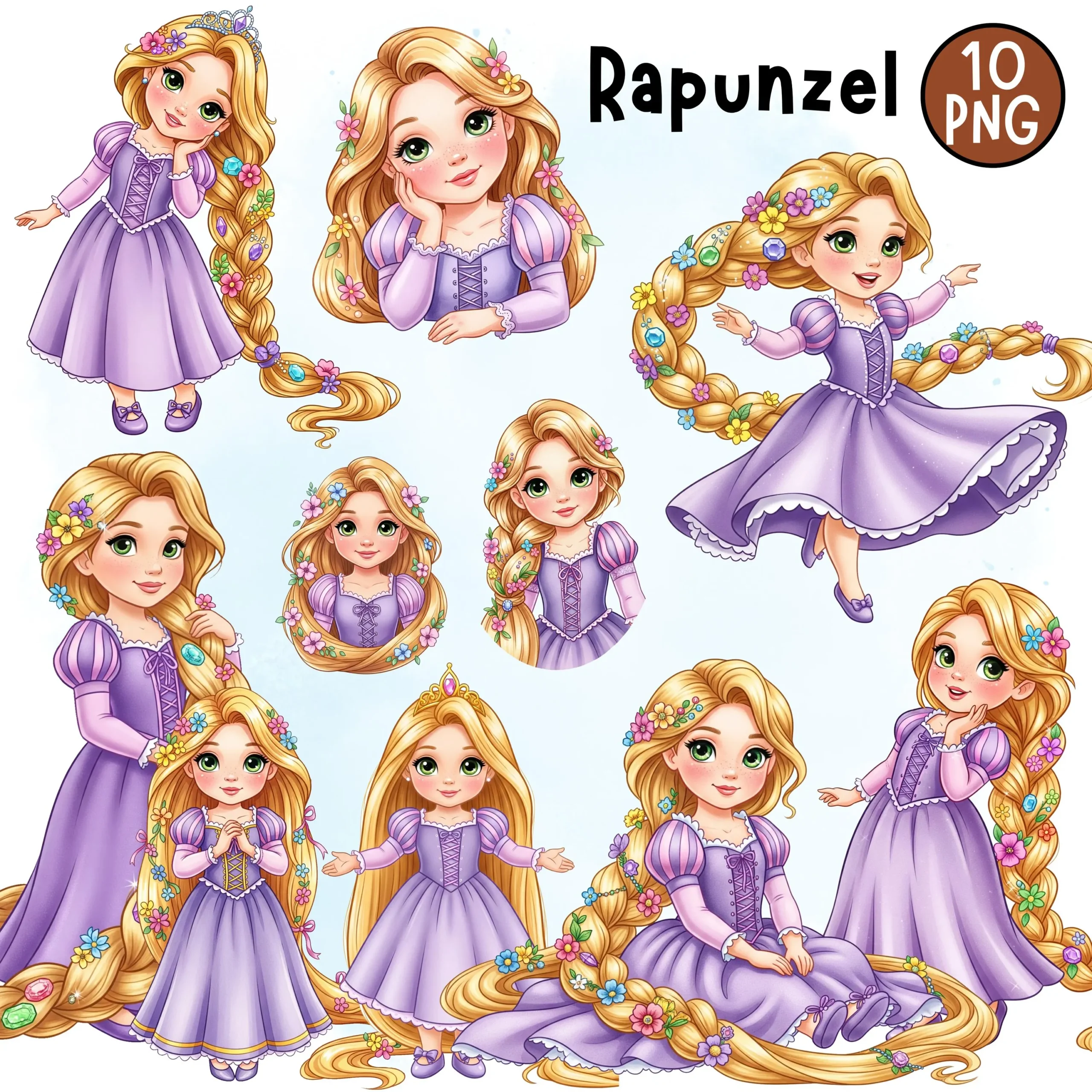 Elevate your creative projects with this boutique digital collection featuring 10 professional illustrations of the iconic tower princess in a soft, toddler-style aesthetic. Each element is rendered with delicate watercolor textures, signature violet tones, and sun-kissed golden hair, perfect for premium print and digital designs.
