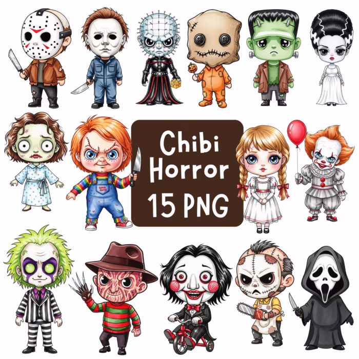 Chibi Horror Villains Clipart Bundle | 15 PNG | Creepy Cute Watercolor Art | Dark Chibi Cartoon Halloween Cliparts, Cute Chibi Horror Villains Clipart