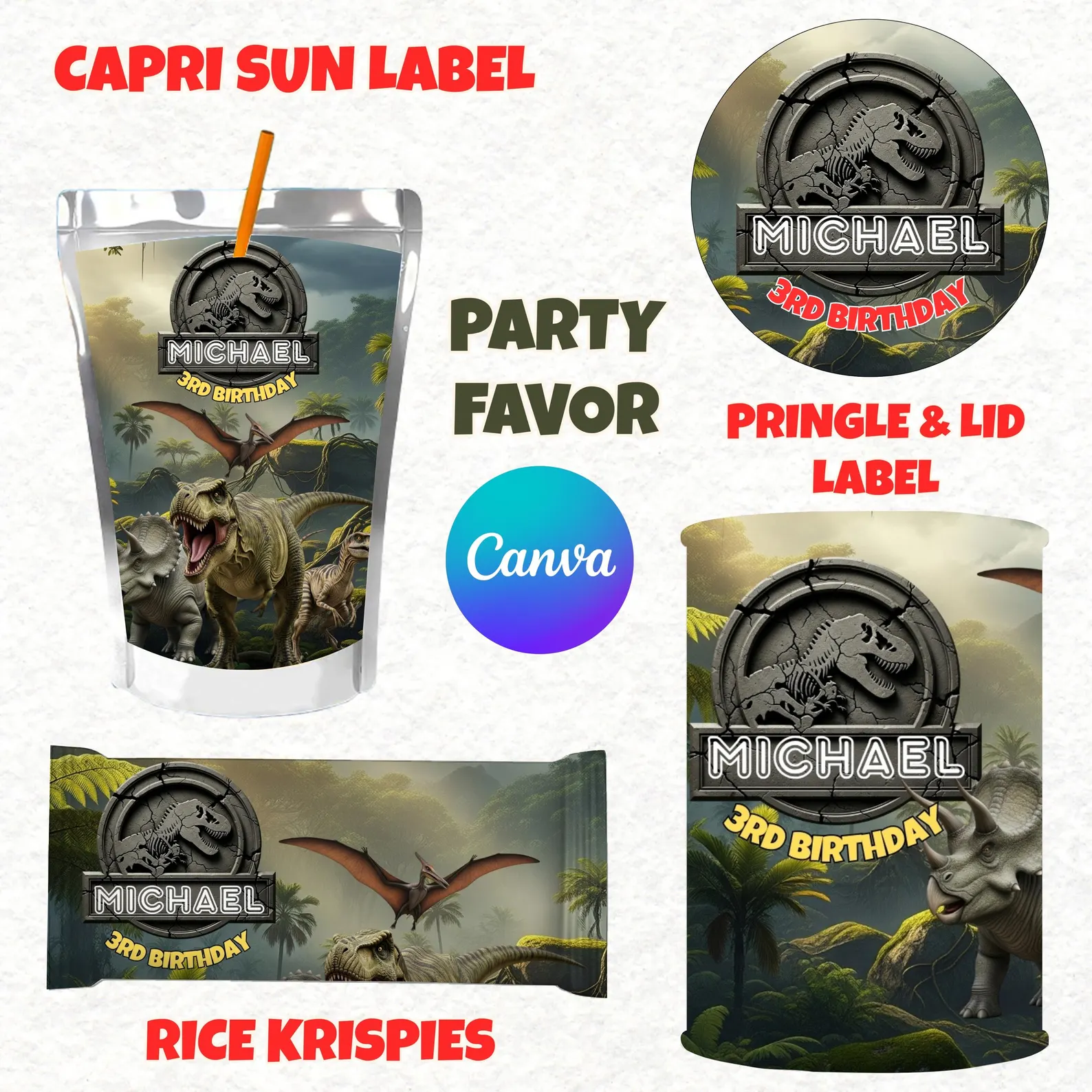 Jurassic Birthday Party Favor Bundle | Dinosaur Printable Labels | Editable Canva Dino Party Kit | Chips Bag, Capri Sun, Soda Can, Pringle & More