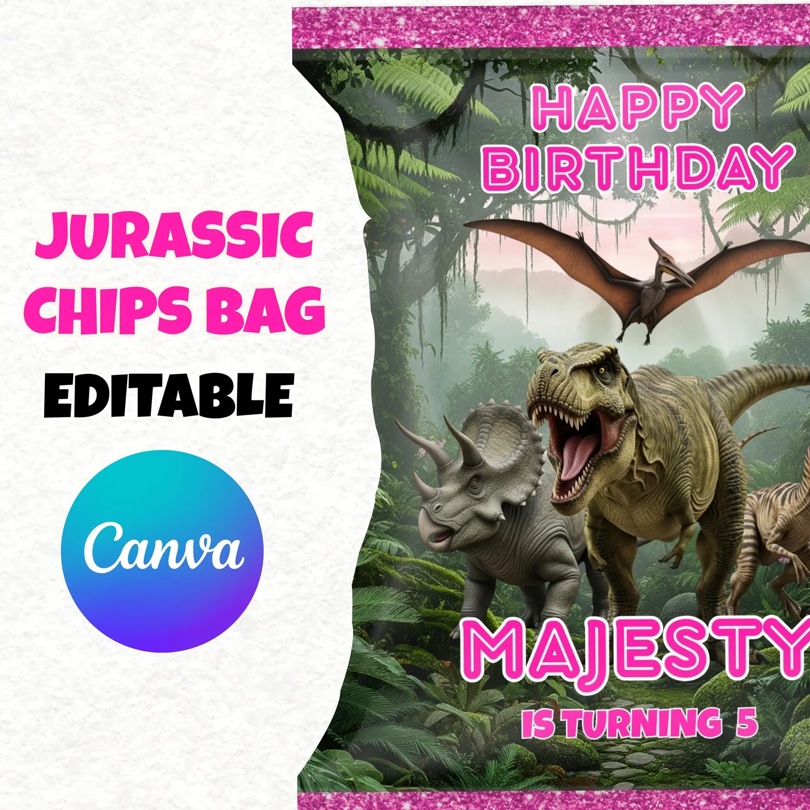 Jurassic Park Pink Birthday Party Favor Bundle | Pink Dinosaur Printable Labels | Editable Canva Dino Party Kit | Chips Bag, Capri Sun & More