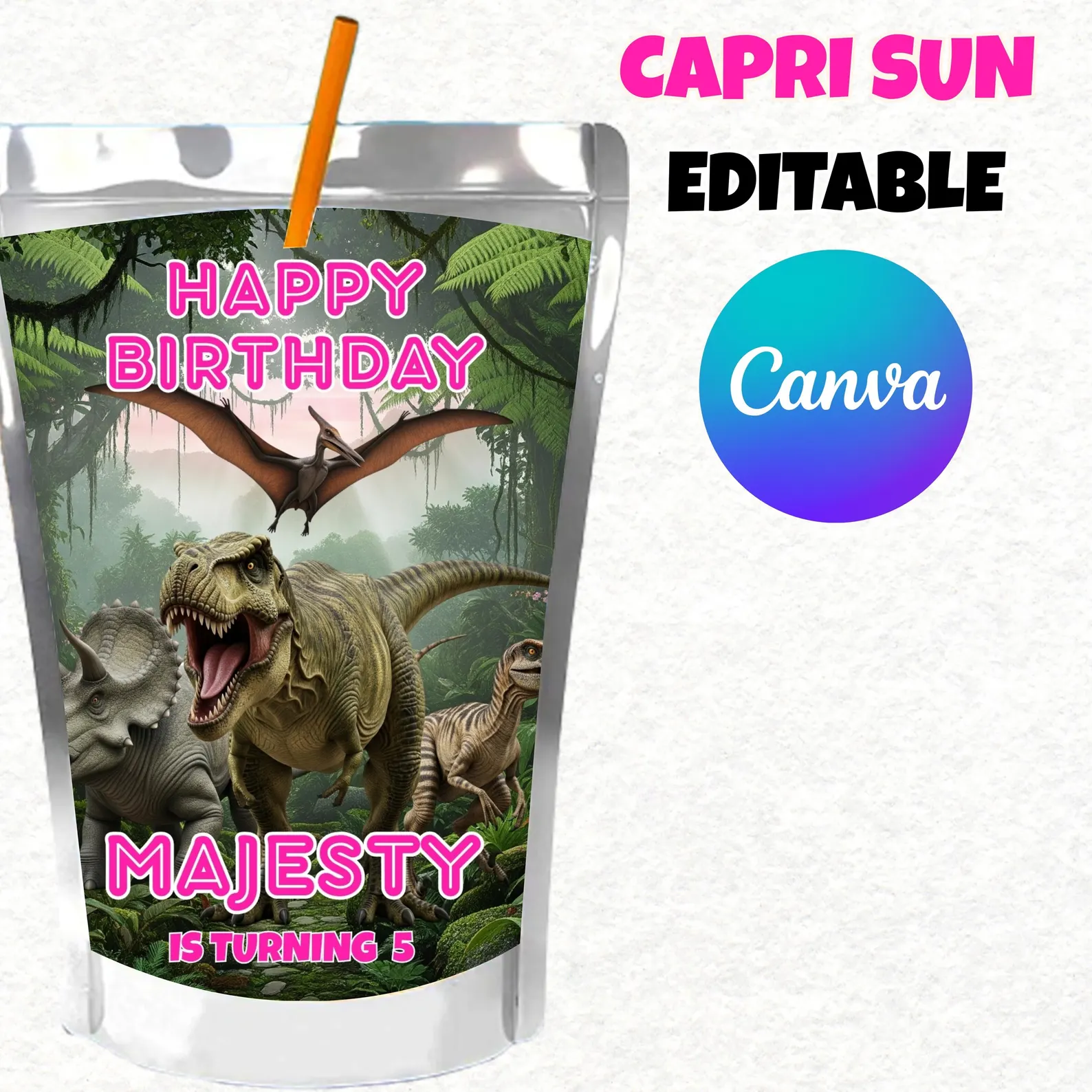 Jurassic Park Pink Birthday Party Favor, Dinosaur Printable Labels, Editable Canva Dino Party Kit, Pink Chips Bag, Capri Sun, Adorable Pink Party Favors
