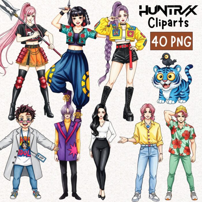Kpop Demon Hunter Clipart Bundle | 40 PNG Files | Hun-trix | Sa-ja Girls & Boys | Cat & Bird | Girl Dinner Meme | Kpop Merch Art, Watercolor Kpop Demon Hunter Clipart
