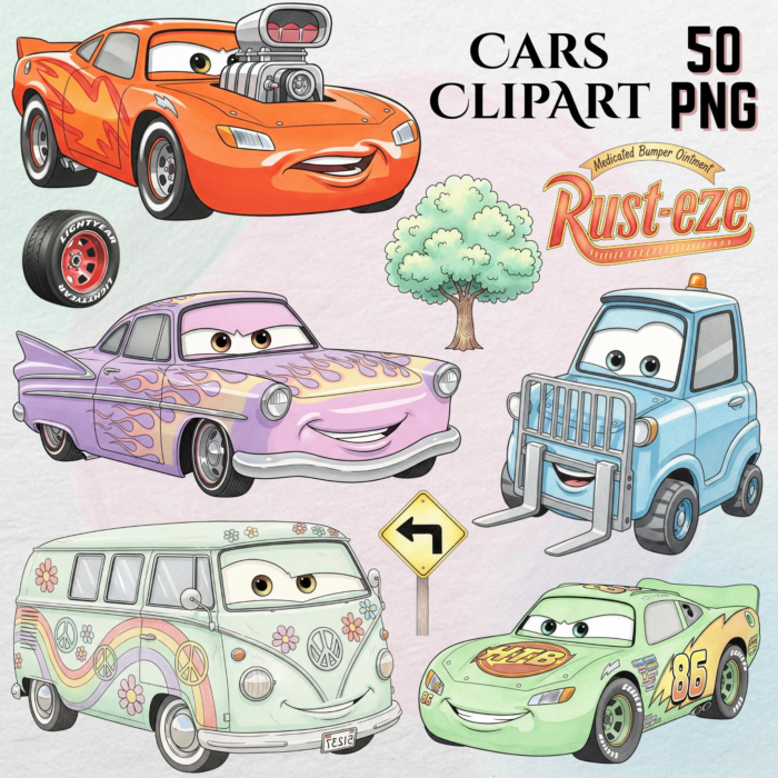 - Featured Characters: Lightning McQueen in various racing stances, Mater the tow truck, and iconic Radiator Springs motifs.