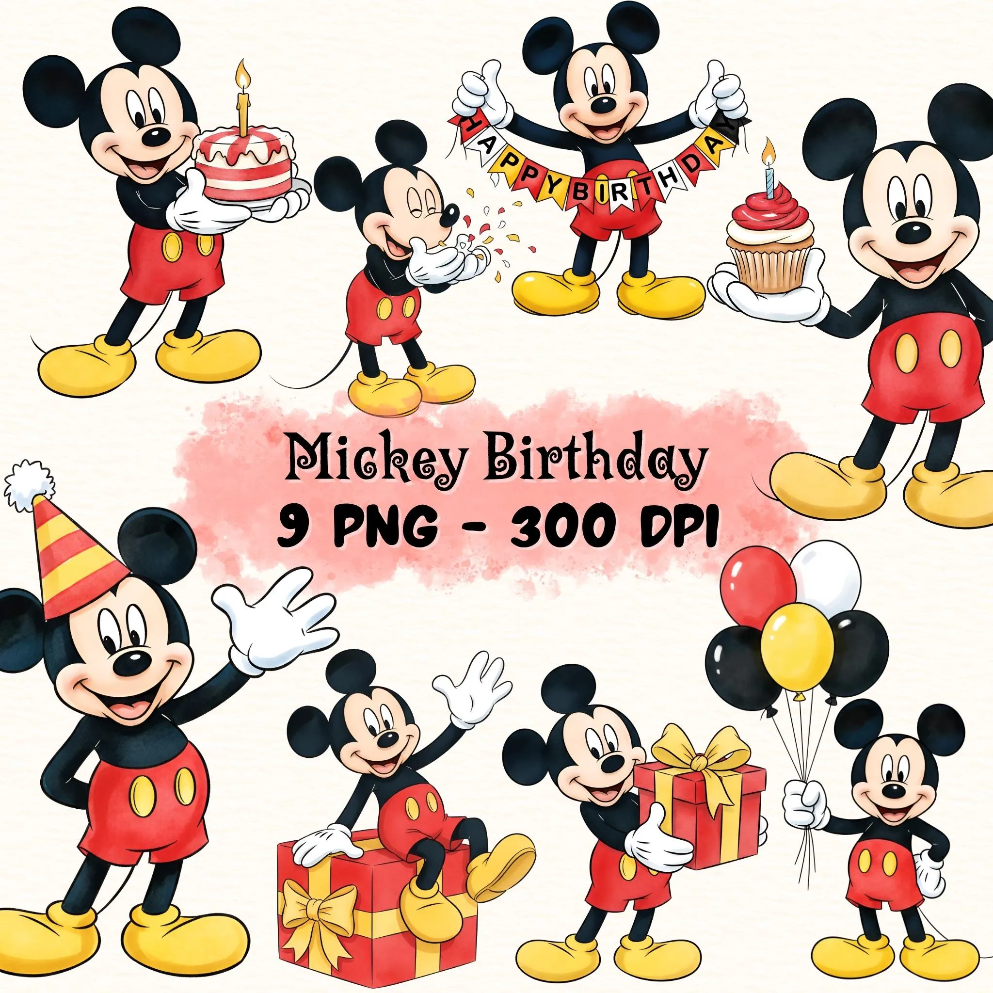 🎉 Mickey Mouse Birthday Clipart | Watercolor Mickey PNG | Mickey Party Decor | Mickey Cake Topper | 9 PNG Files