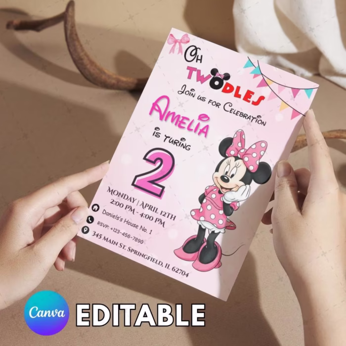 Editable Minnie Birthday Invitation Card | Pink Mouse Party Invite | Baby Girl Birthday Card | Canva Template | Instant Download