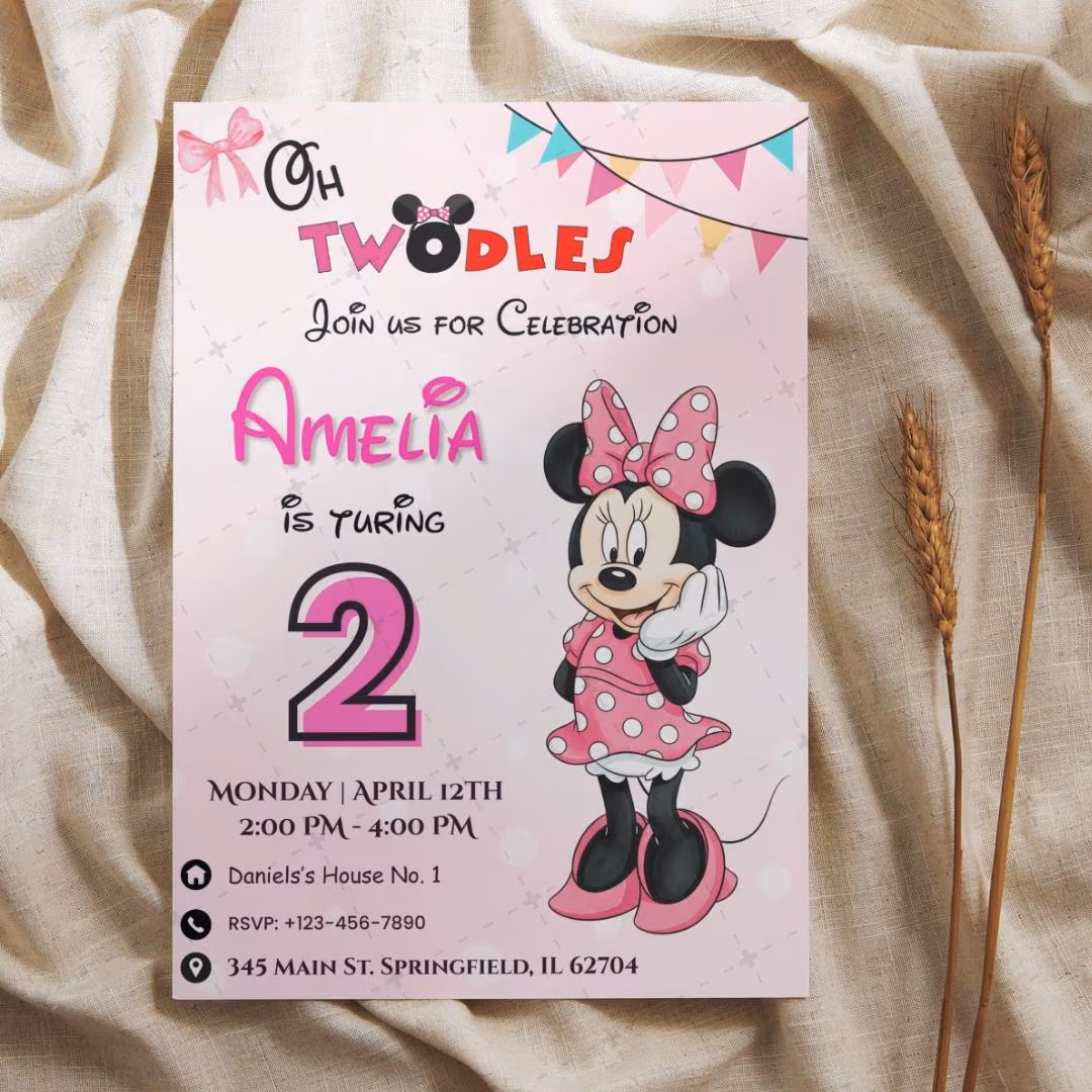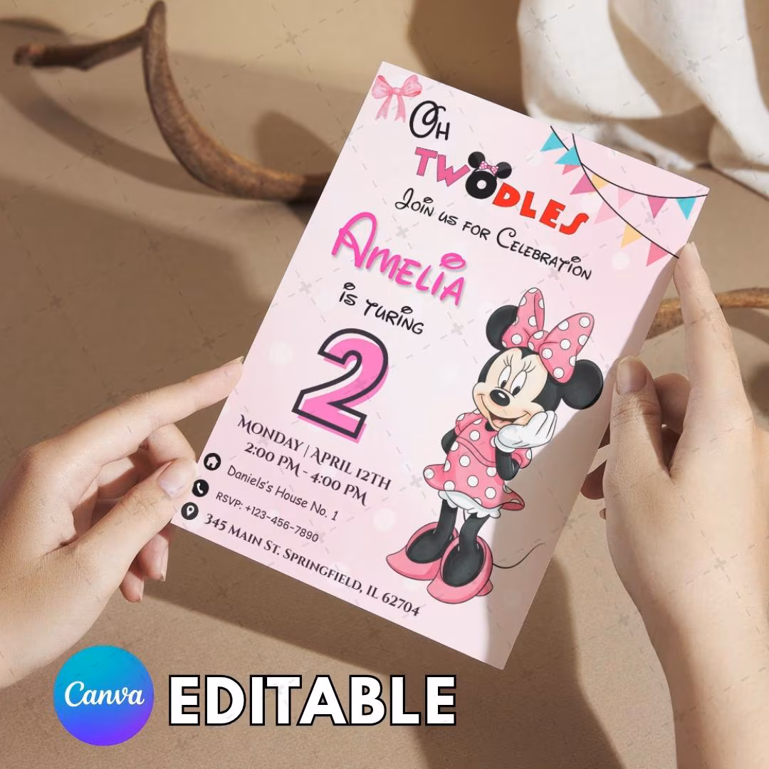Editable Minnie Birthday Invitation Card, Minnie Birthday Invitation, Adorable Baby Girl Birthday, Cute Pink Mouse Invitation, Canva Editable