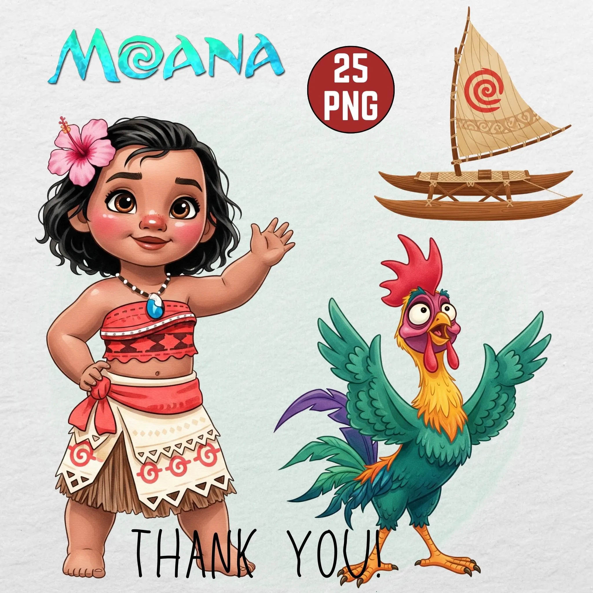 Set sail on your next creative project with this boutique digital collection. Featuring over 25 professional illustrations inspired by the adventurous voyager of Motunui in a soft, watercolor aesthetic, each element is rendered with rich textures, vibrant island tones, and refined shading.