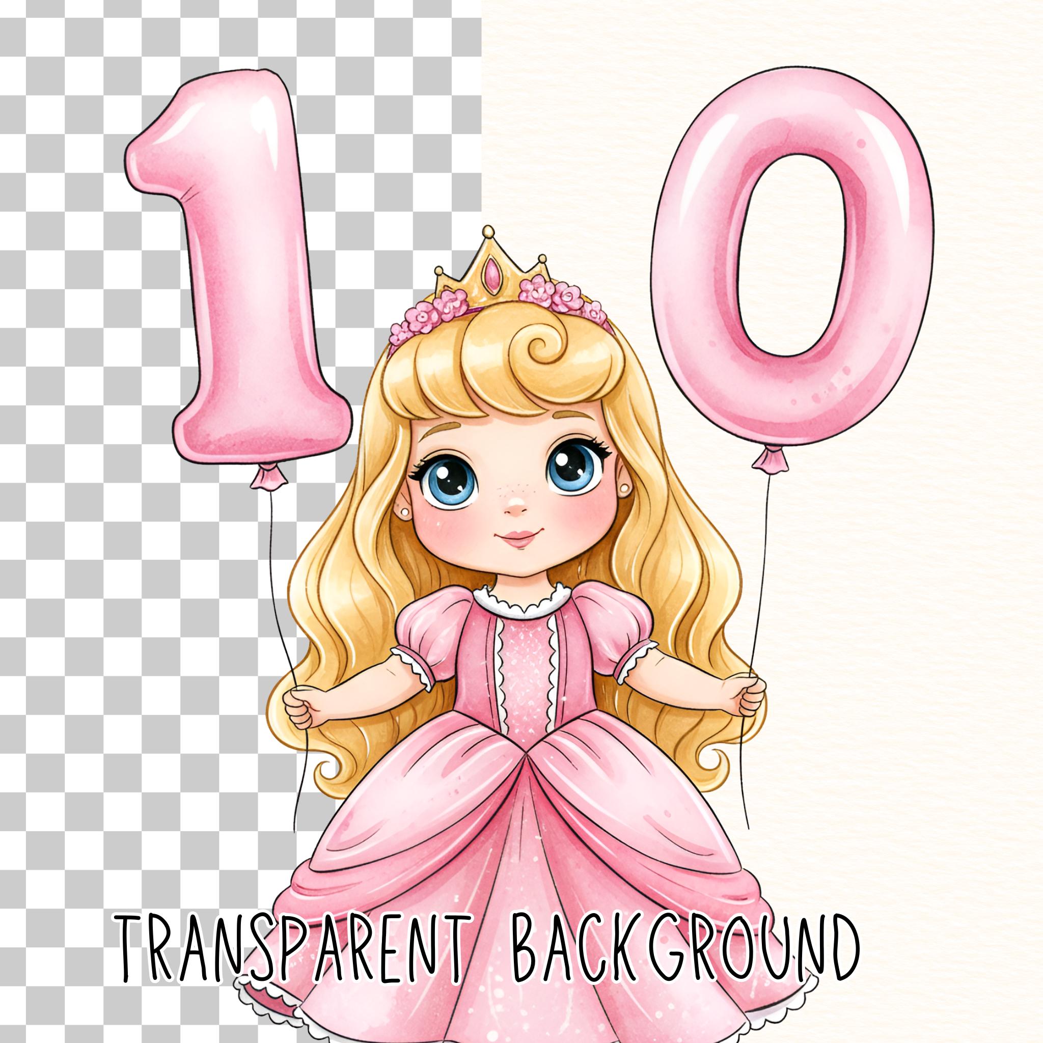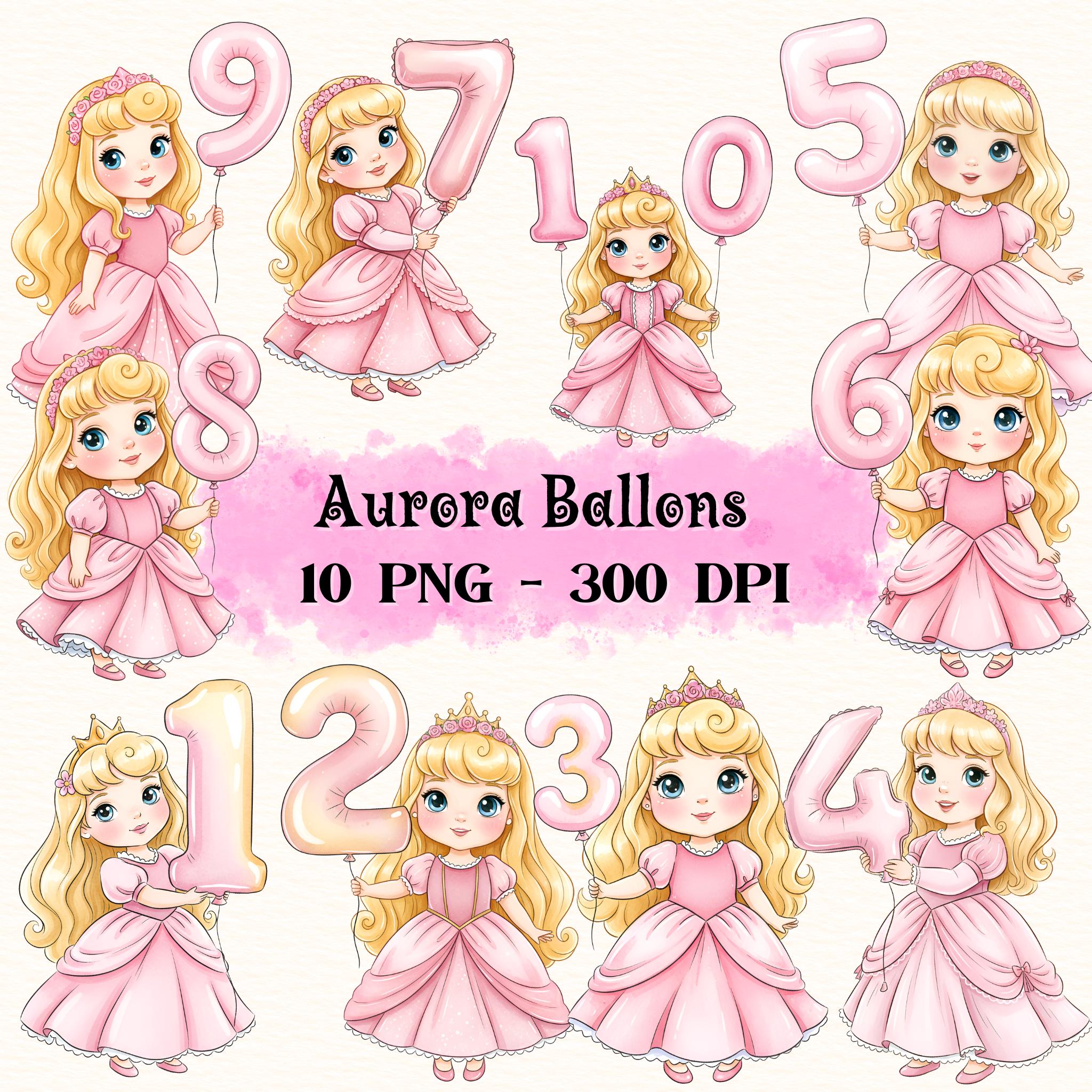 Princess Aurora Clipart | Watercolor Aurora Holding Number Balloons | Sleeping Beauty PNG | Birthday Party Decor | Cake Topper | 10 PNG Files ✨🌸