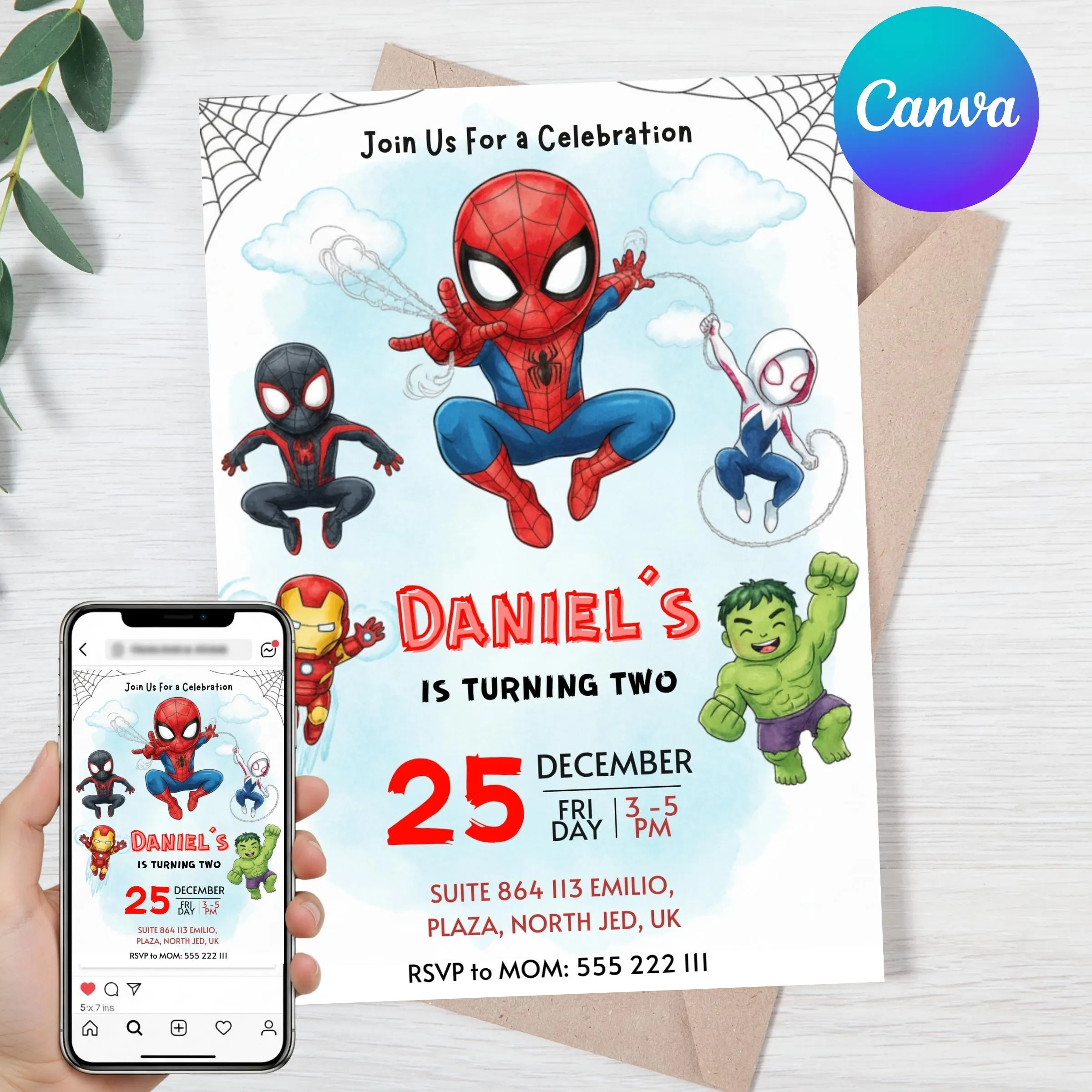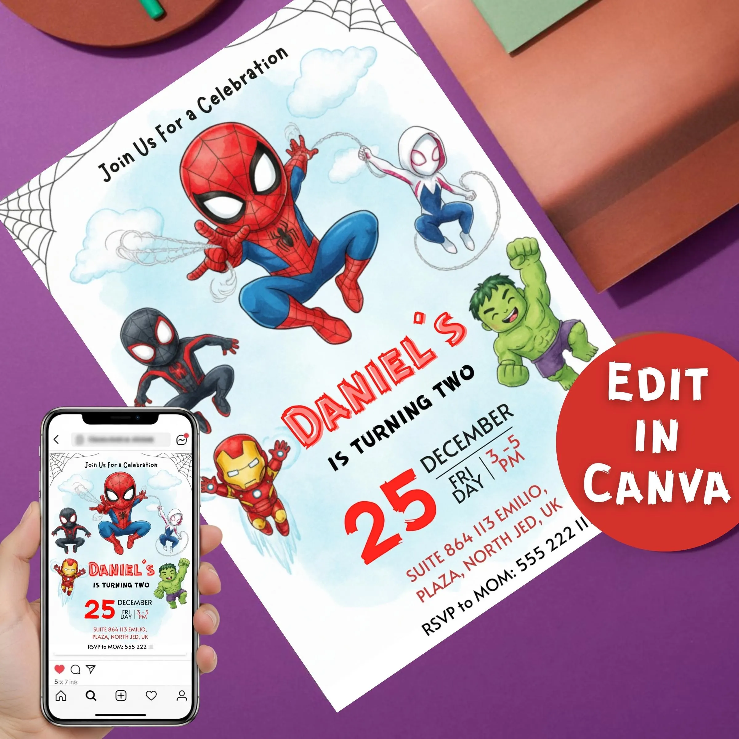 Spidey Friends Birthday Invitation, Editable Spidey and His Amazing Friends Birthday Invitation Card, Watercolor Superhero Template Printable