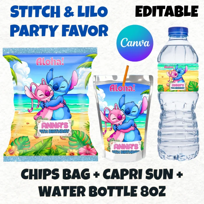 Stitch Birthday Party Favors | Chips Bag, Water Bottle Wrap & Capri Sun Label | Editable Printable Canva Party Kit
