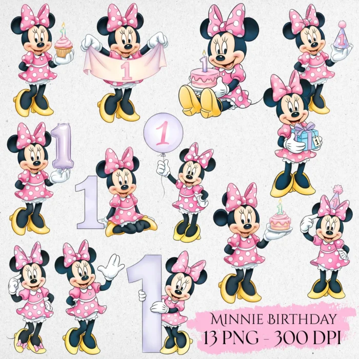 Watercolor Minnie Mouse Clipart Collection | 1st Birthday Purple Theme | High-Quality PNG Bundle for Birthday, Nursery, Invitations & Crafts