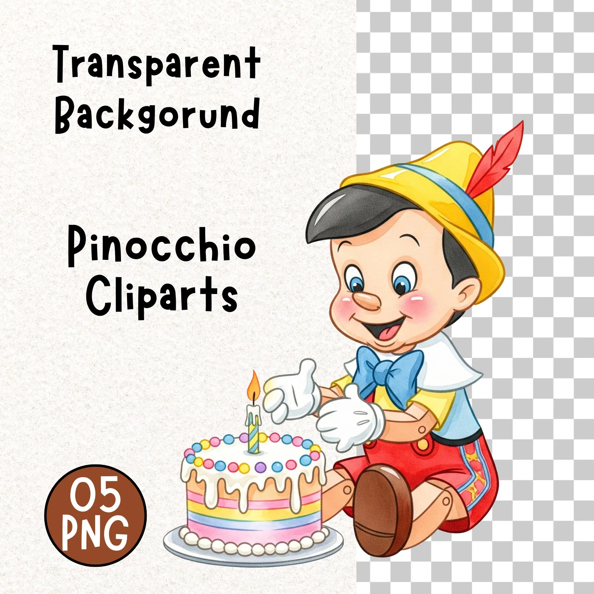 This professional digital collection features high-resolution illustrations inspired by the classic wooden boy of the fairytale world in a soft, toddler-style aesthetic. Each element is rendered with warm watercolor textures, traditional Italian-inspired tones, and refined shading, making them ideal for premium print and digital creative projects.